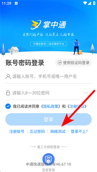 1、打開(kāi)掌中通APP,我們需要在登錄界面點(diǎn)擊網(wǎng)絡(luò)測(cè)試。
