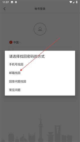 3、在提示框中點擊郵箱找回選項,進入忘記密碼頁面。