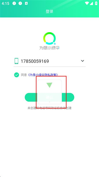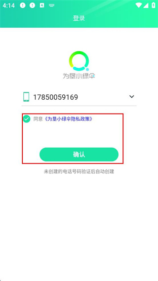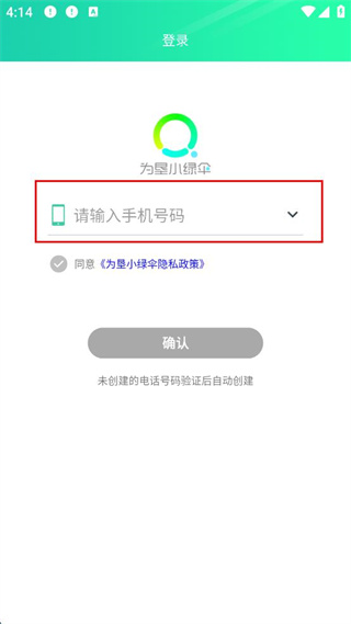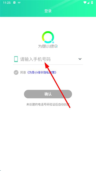 1、在為墾小綠傘app登錄界面,輸入手機(jī)號(hào)碼,勾選同意隱私政策后,點(diǎn)擊確認(rèn)。