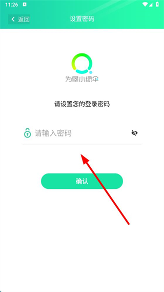 3、在設(shè)置密碼界面,輸入登錄密碼后點(diǎn)擊確認(rèn),即可完成為墾小綠傘的注冊(cè)。