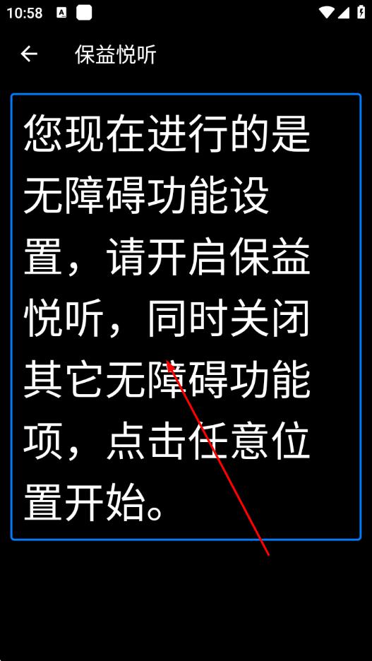 3、按照提示,開啟保益悅聽,并關(guān)閉其他無(wú)障礙功能項(xiàng),點(diǎn)擊屏幕任意位置開始設(shè)置。