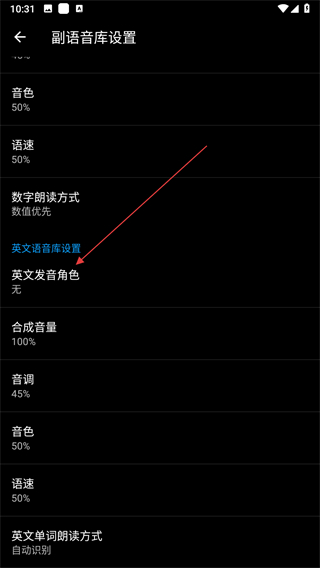 3、在副語(yǔ)音庫(kù)設(shè)置頁(yè)面,點(diǎn)擊英文發(fā)音角色選項(xiàng)。