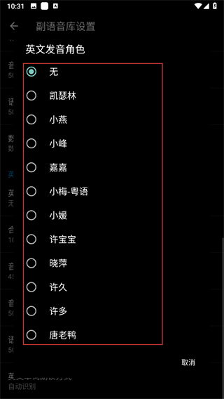 4、在英文發(fā)音角色列表中,選擇并點(diǎn)擊自己喜歡的音色。
