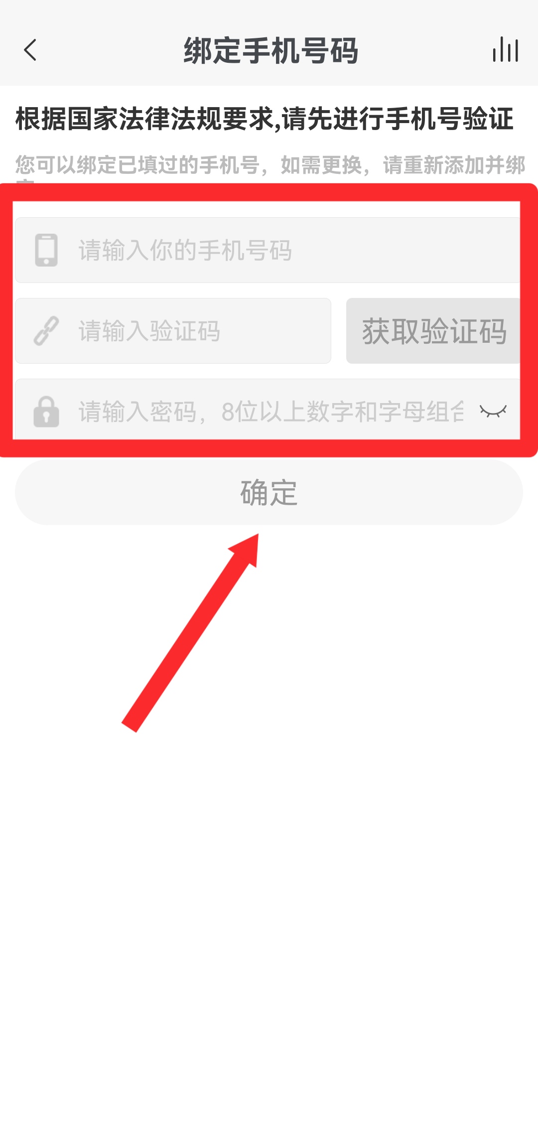 4、在頁面輸入手機號、驗證碼和密碼后點擊確定,完成號碼綁定。