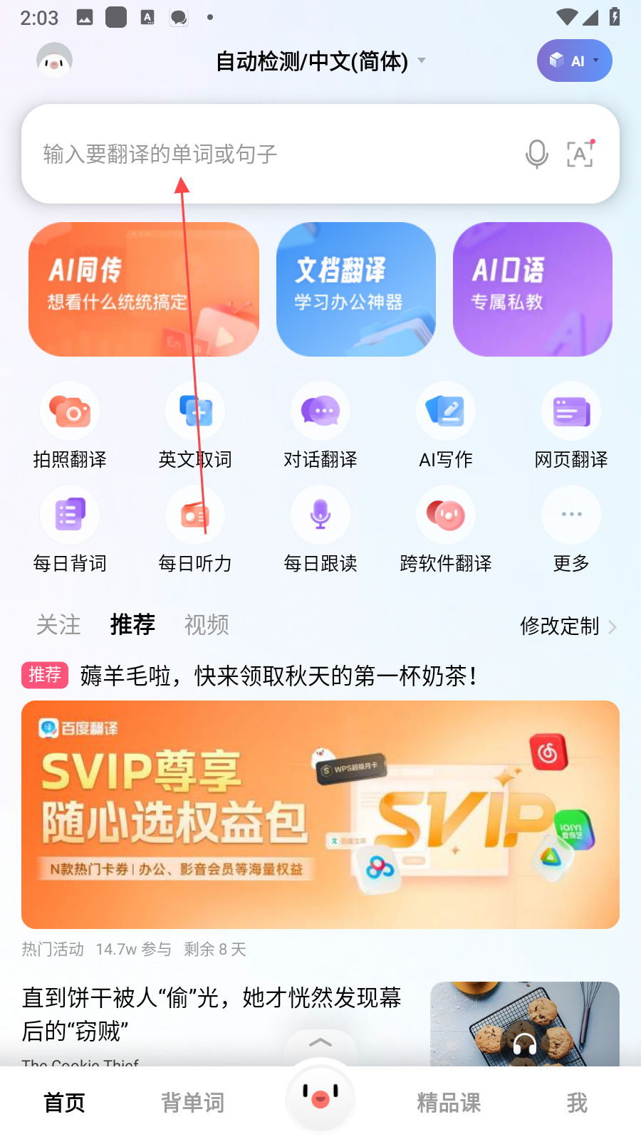 1、打開百度翻譯應(yīng)用進(jìn)入首頁(yè),在頂部輸入框內(nèi)直接輸入想要翻譯的單詞或句子,就能快速獲取翻譯結(jié)果。