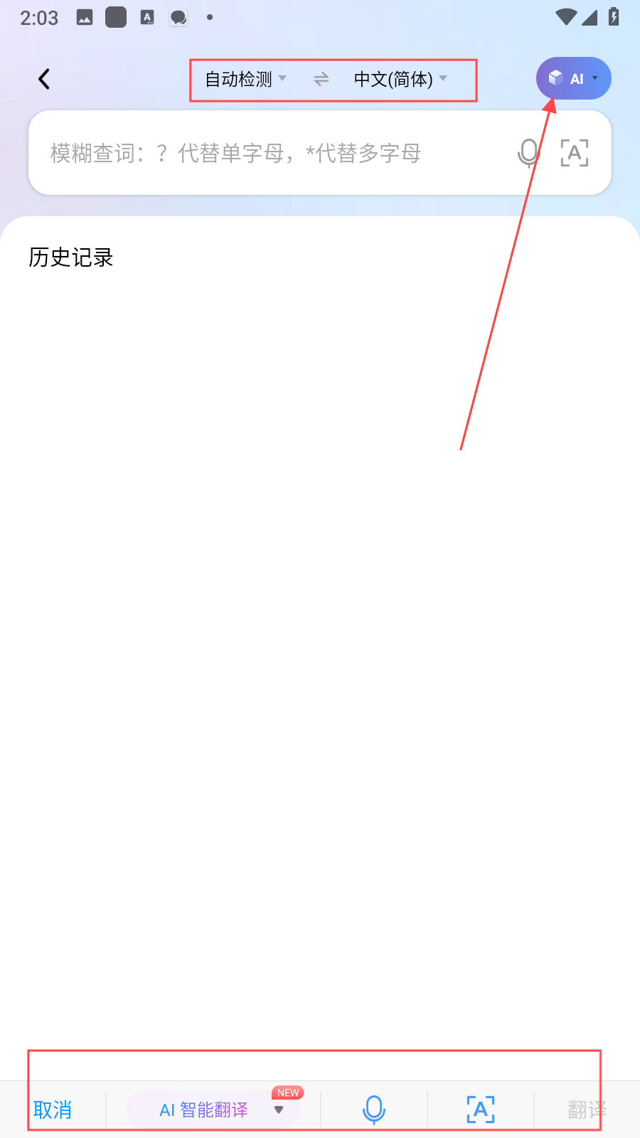 2、點(diǎn)擊輸入框上方的語(yǔ)言選項(xiàng)框,可對(duì)源語(yǔ)言和目標(biāo)語(yǔ)言進(jìn)行設(shè)置,比如將源語(yǔ)言設(shè)為英語(yǔ),目標(biāo)語(yǔ)言設(shè)為中文(簡(jiǎn)體),同時(shí)點(diǎn)擊右側(cè)AI按鈕,還能選擇不同的AI翻譯模式。