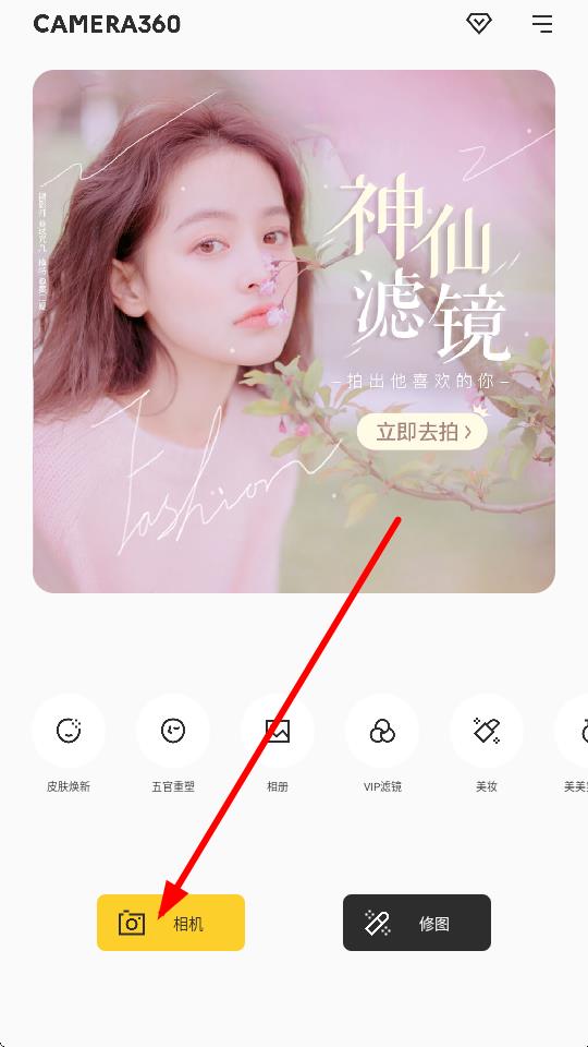 1、打開相機(jī)360應(yīng)用,在主界面點(diǎn)擊下方黃色的相機(jī)按鈕,進(jìn)入拍攝界面。