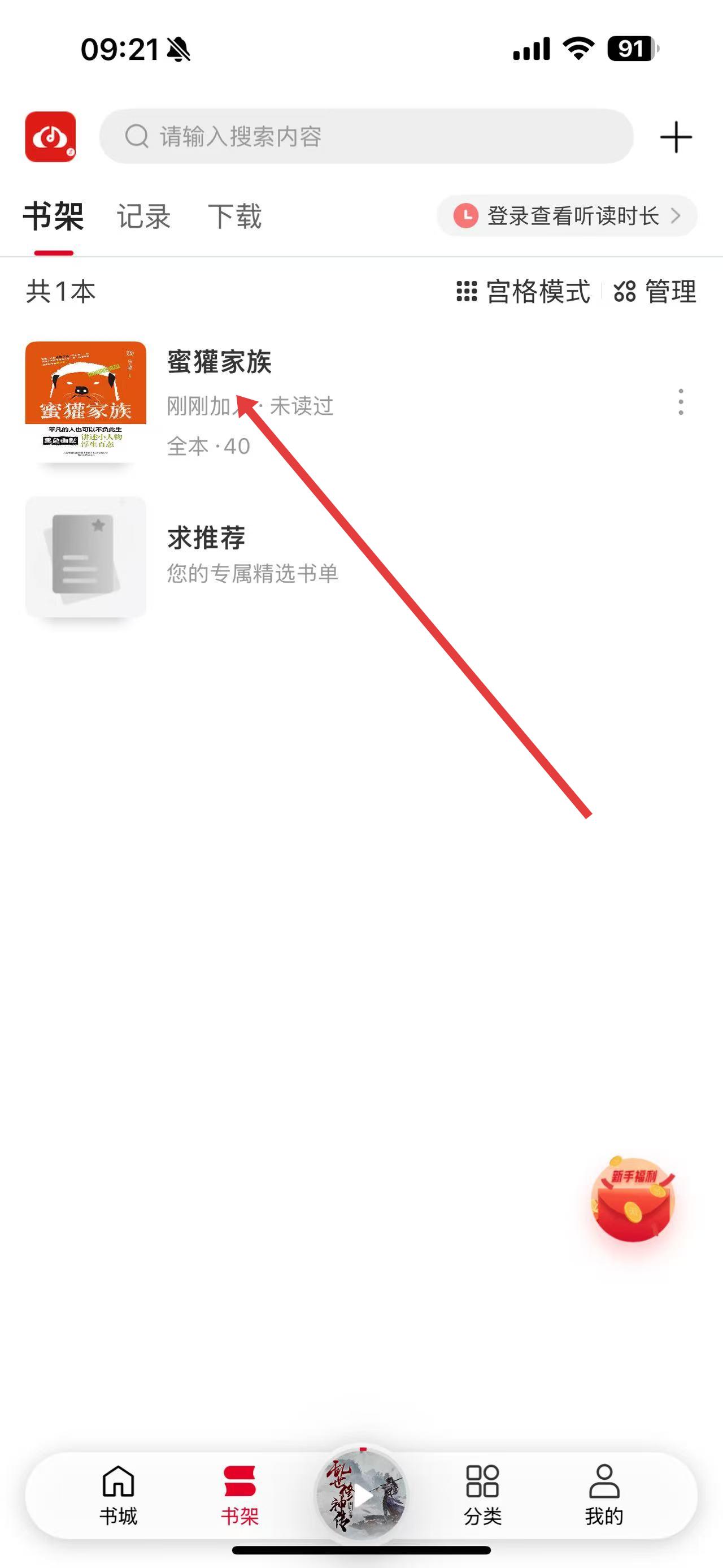 2、在書架頁面中,點擊想要閱讀的書籍,比如蜜獾家族。