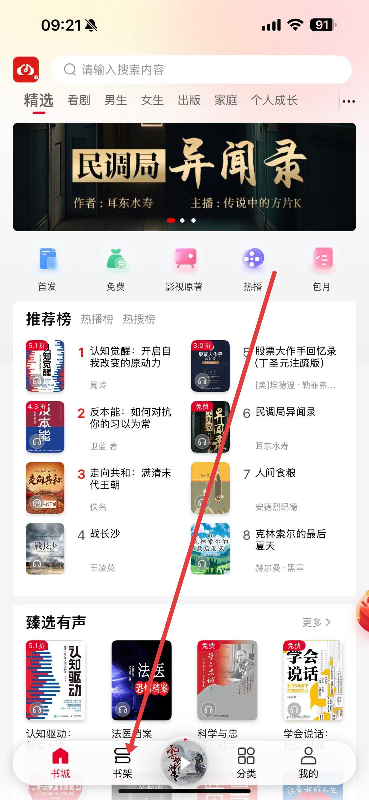 1、打開聯(lián)通愛聽APP,點擊底部導航欄中的書架選項進入書架頁面。