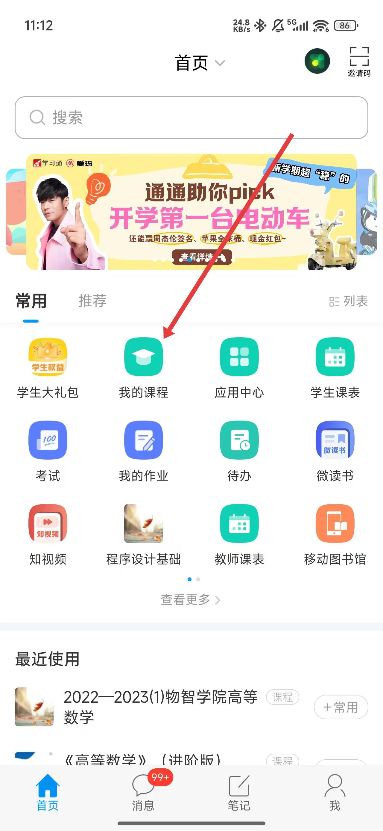 1、在進(jìn)入到學(xué)習(xí)通首頁中,可點(diǎn)擊我的課程按鈕,進(jìn)入查看相關(guān)內(nèi)容。