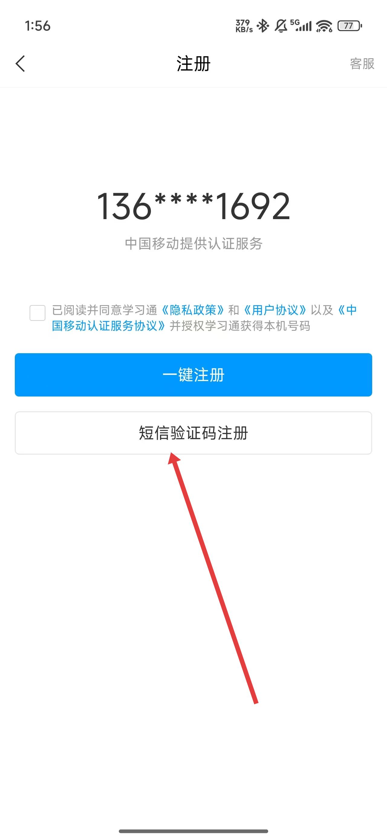 2、進(jìn)入到注冊(cè)頁(yè)面中,可以點(diǎn)擊短信驗(yàn)證碼注冊(cè)按鈕,使用驗(yàn)證碼注冊(cè)賬號(hào)。