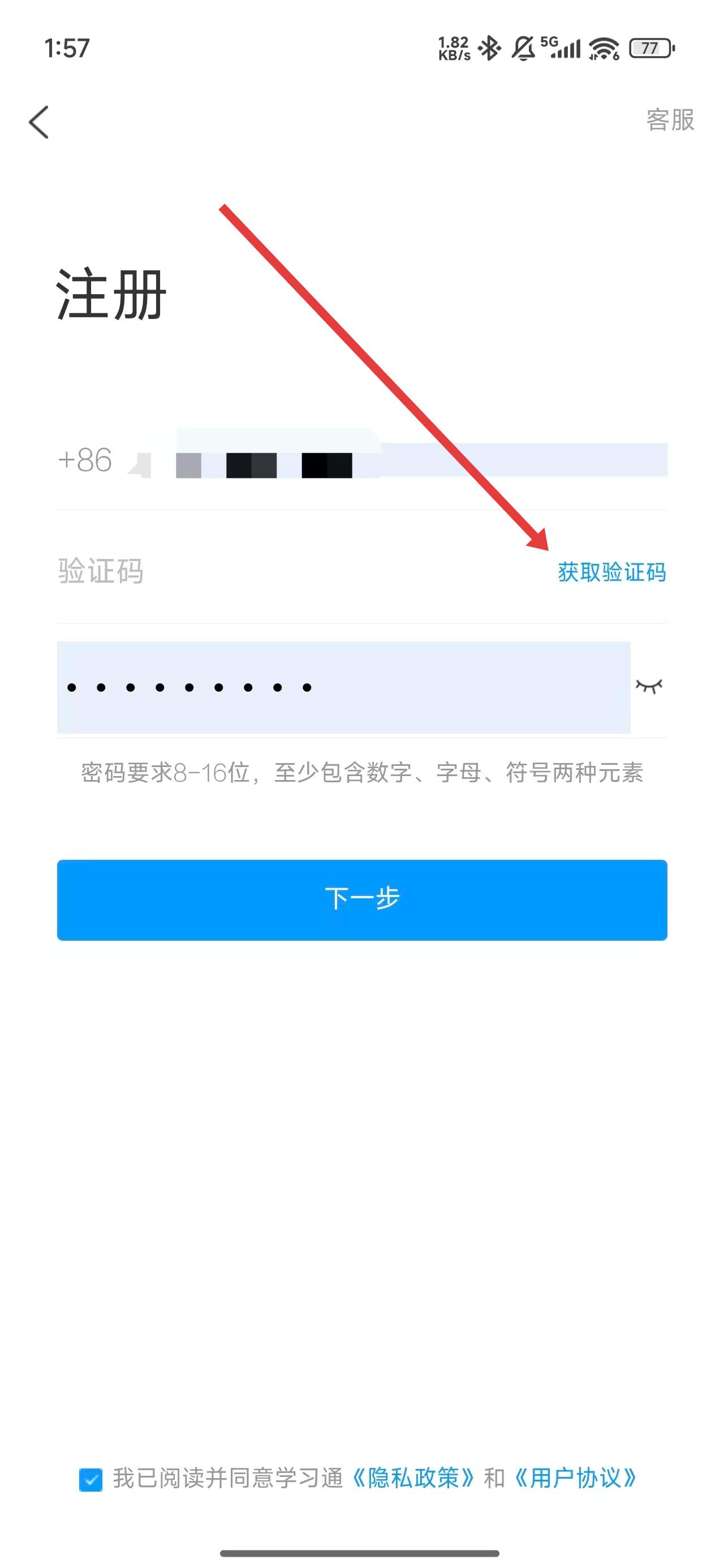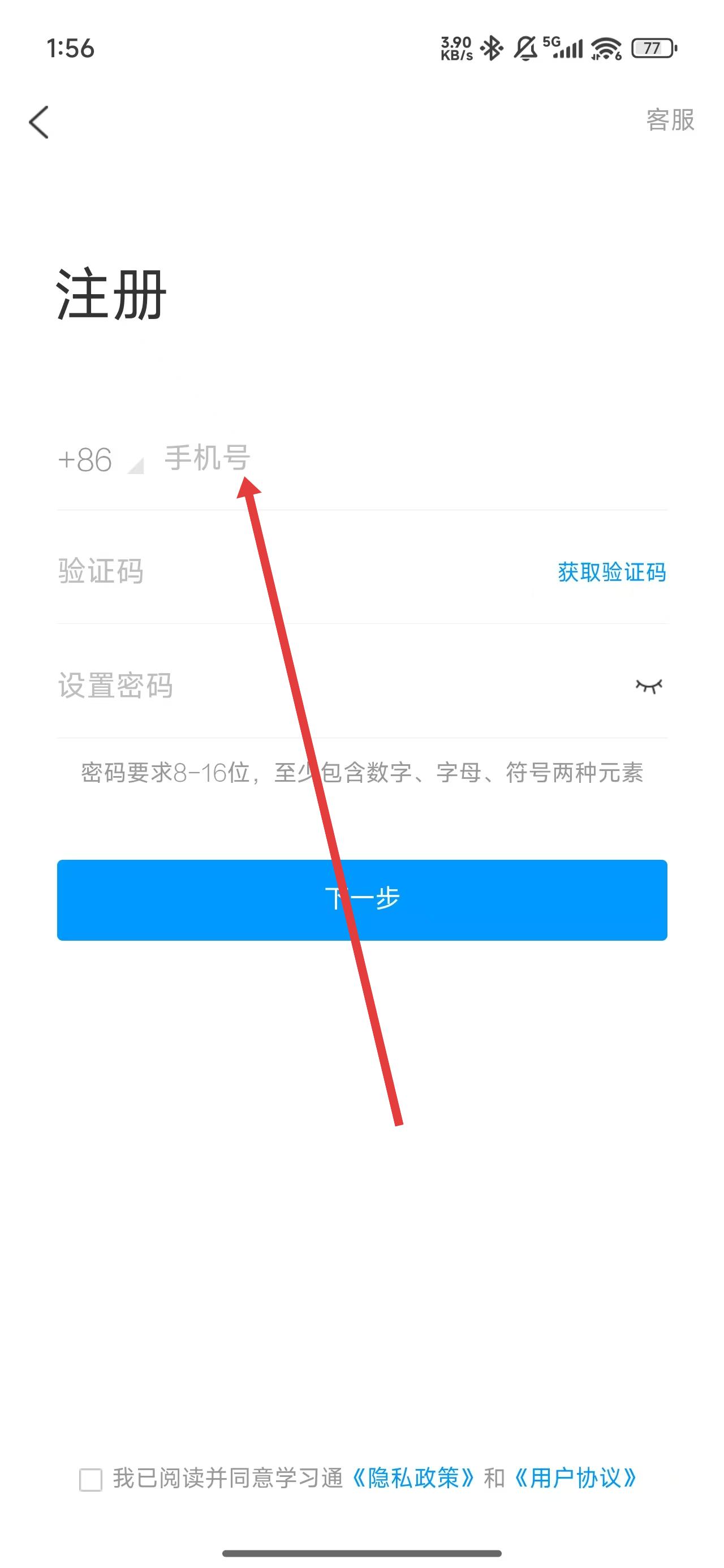 3、在注冊(cè)操作頁(yè)面中,點(diǎn)擊輸入框輸入手機(jī)號(hào)以便獲取驗(yàn)證碼。