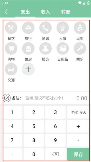 4、登錄后點(diǎn)擊記賬按鈕,選擇支出類別,輸入金額后點(diǎn)擊保存。