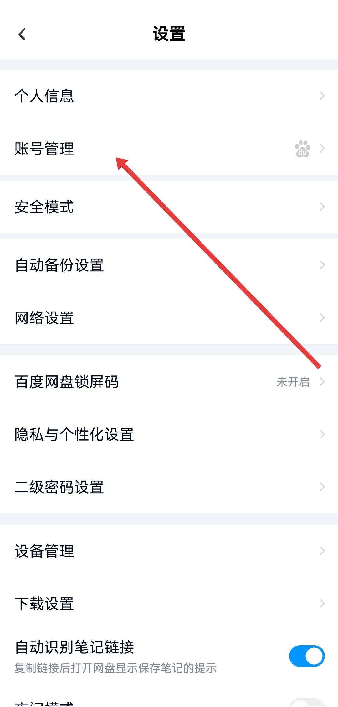 1、打開(kāi)百度網(wǎng)盤APP的設(shè)置頁(yè)面,在設(shè)置列表中找到并點(diǎn)擊賬號(hào)管理選項(xiàng),進(jìn)入賬號(hào)管理界面。