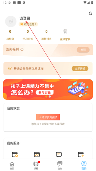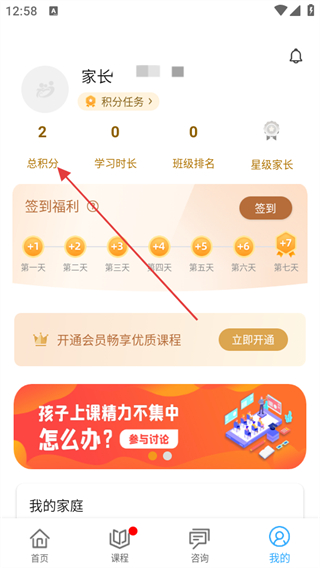 2、在我的頁面中,點擊家長昵稱下方的總積分區(qū)域,進(jìn)入我的積分頁面。