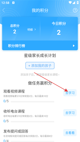 3、找到做任務(wù)贏積”板塊,點擊右側(cè)的去學(xué)習(xí)按鈕,完成對應(yīng)任務(wù),即可獲取積分。