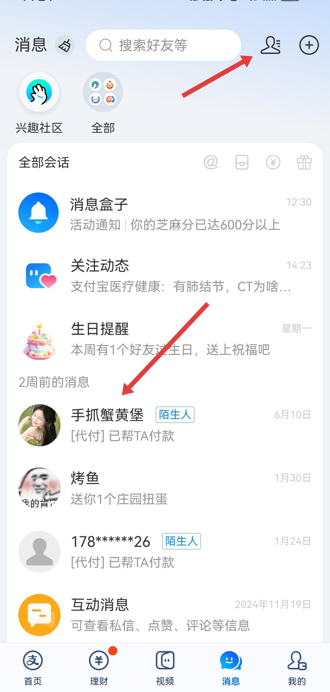 1、打開支付寶app,進(jìn)入消息的頁面,找到并點(diǎn)擊要轉(zhuǎn)賬的聯(lián)系人會話,或者利用右上角的通訊錄來尋找聯(lián)系人。