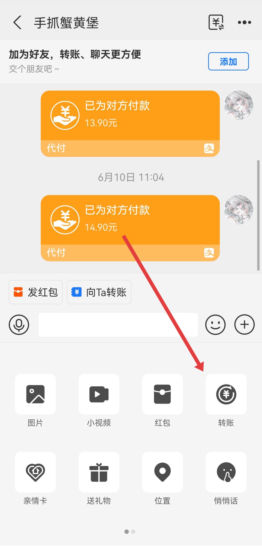 2、進(jìn)入需要轉(zhuǎn)賬的聯(lián)系人的聊天窗口底部功能欄中,點(diǎn)擊轉(zhuǎn)賬按鈕,進(jìn)入轉(zhuǎn)賬金額輸入頁面。