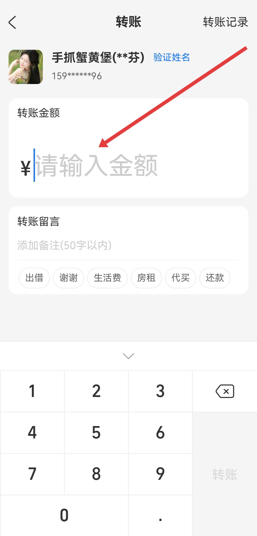 3、在轉(zhuǎn)賬頁面的請輸入金額輸入框中填寫轉(zhuǎn)賬金額,確認(rèn)信息無誤后點(diǎn)擊轉(zhuǎn)賬完成支付就可以了。