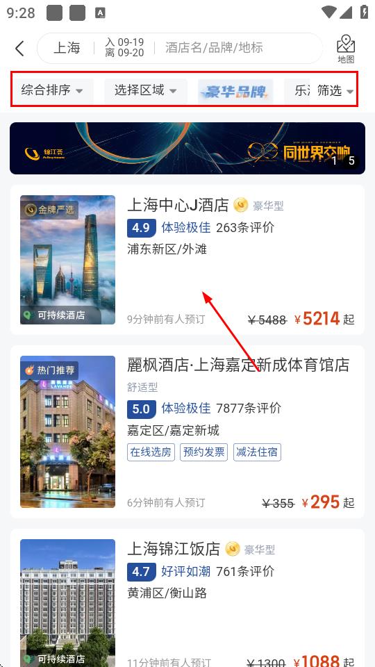 2、在酒店列表頁面,可通過綜合排序、選擇區(qū)域、篩選品牌等方式,找到心儀的酒店并點擊進(jìn)入。