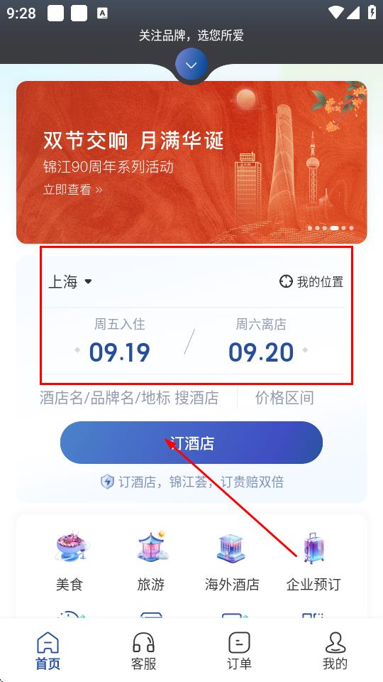 1、打開錦江薈APP,在首頁選擇入住城市、入住和離店日期,點擊訂酒店。