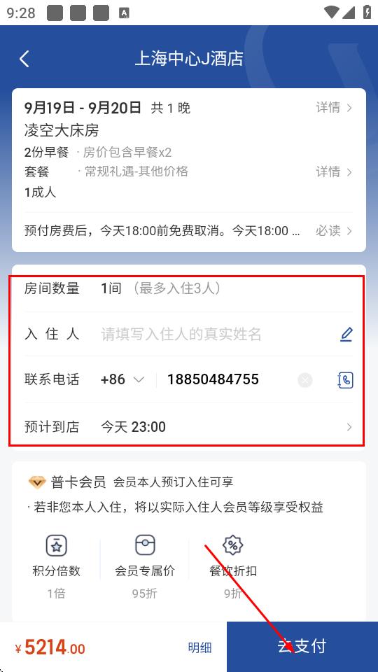 4、在預(yù)訂頁面,填寫入住人、聯(lián)系電話、預(yù)計到店時間等信息,點擊去支付,完成支付即可完成酒店預(yù)訂。