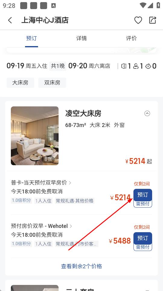 3、進(jìn)入酒店詳情頁后,選擇合適的房型,點擊預(yù)訂。