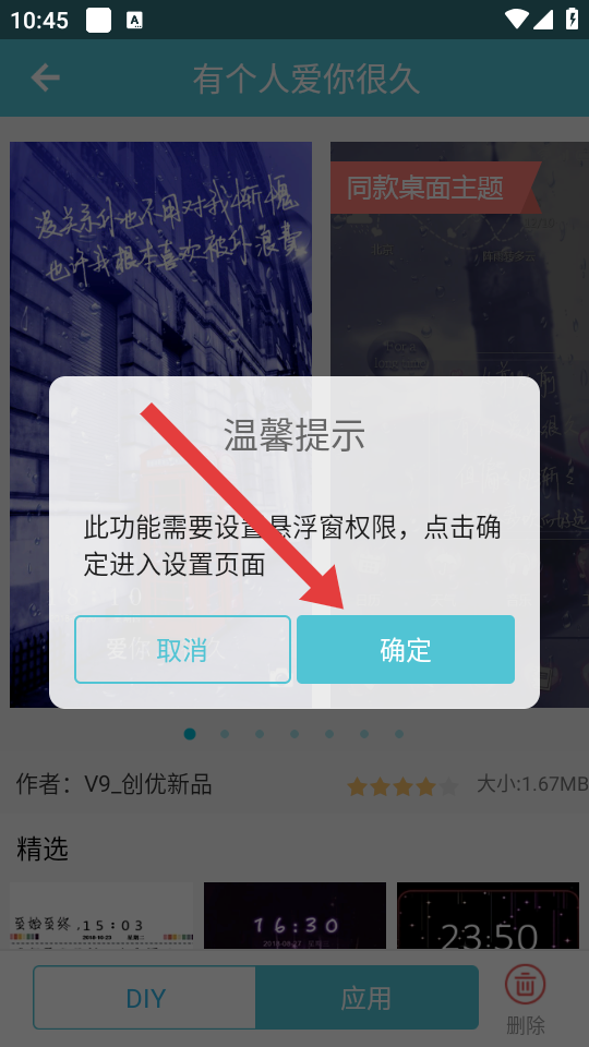 4、彈出溫馨提示需設置懸浮窗權(quán)限后,點擊確定按鈕,即可使用該鎖屏壁紙。