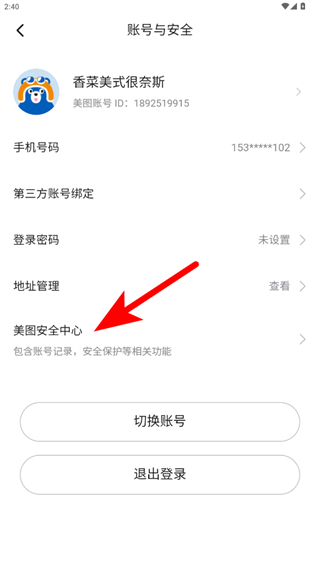 4、在賬號(hào)與安全頁(yè)面點(diǎn)擊美圖安全中心。