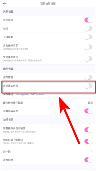 4、在我的拍照設(shè)置頁(yè)面找到自動(dòng)添加水印選項(xiàng),開(kāi)啟該功能,即可在美顏相機(jī)中添加水印。