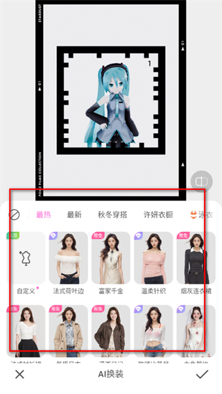 3、在AI換裝設(shè)置頁(yè)面選擇喜歡的服裝樣式,完成服裝更換。