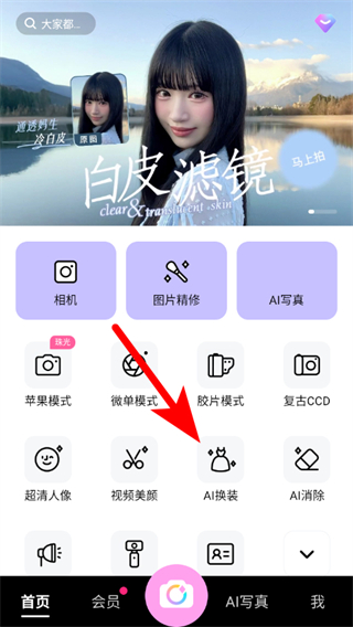 1、打開(kāi)美顏相機(jī)APP,在首頁(yè)找到AI換裝選項(xiàng)并點(diǎn)擊,進(jìn)入圖片選擇頁(yè)面。