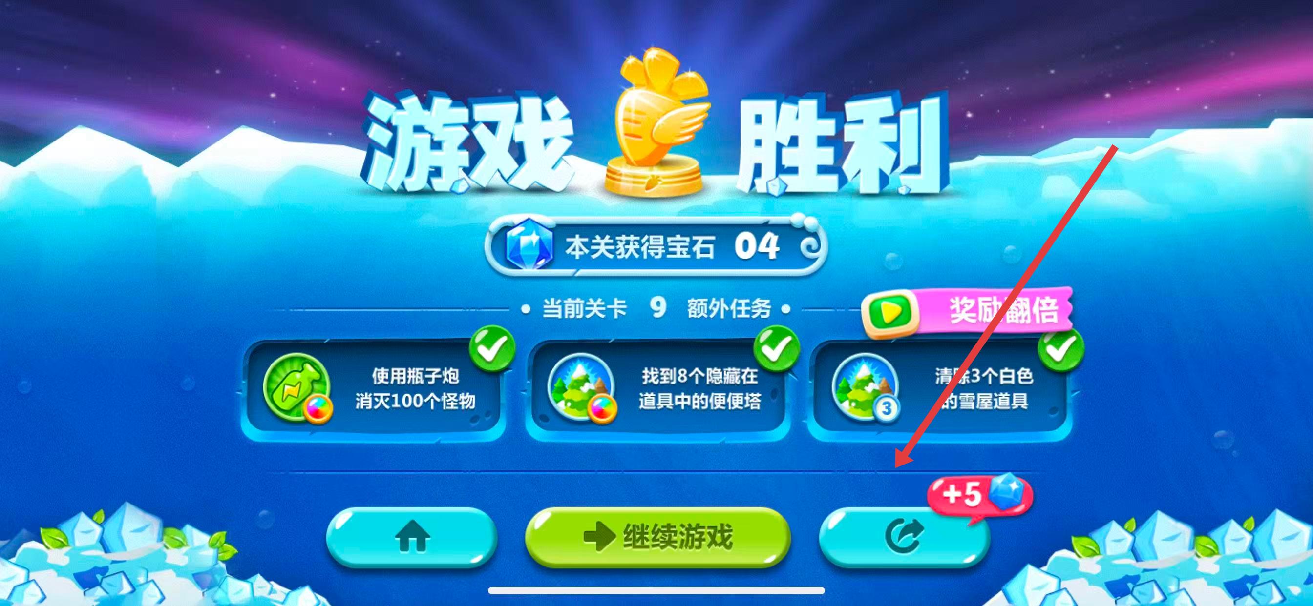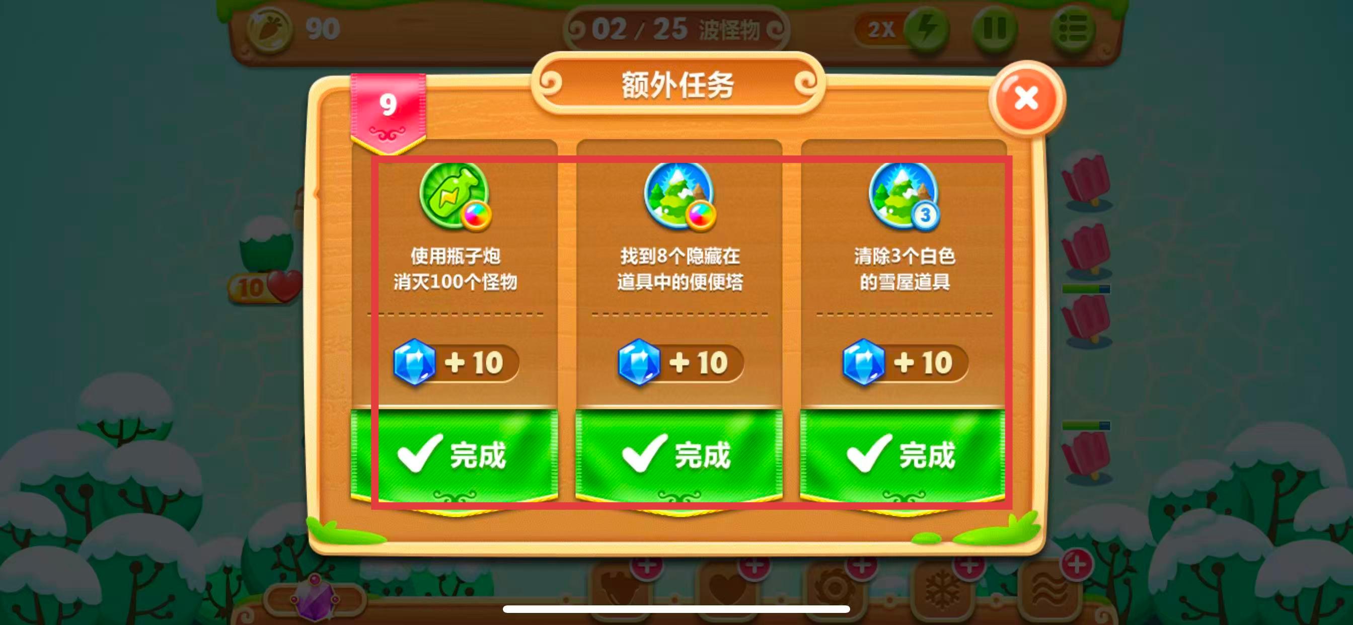 1、查看每一關(guān)的額外任務(wù)要求,像第9關(guān)使用瓶子炮消滅100個(gè)怪物、找到8個(gè)隱藏在道具中的便便塔、清除3個(gè)白色的雪屋道具,一個(gè)任務(wù)完成即可獲得十個(gè)晶體。