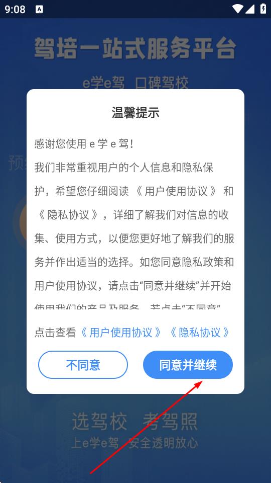1、打開e學(xué)e駕應(yīng)用,在彈出的溫馨提示頁面,點(diǎn)擊同意并繼續(xù)。