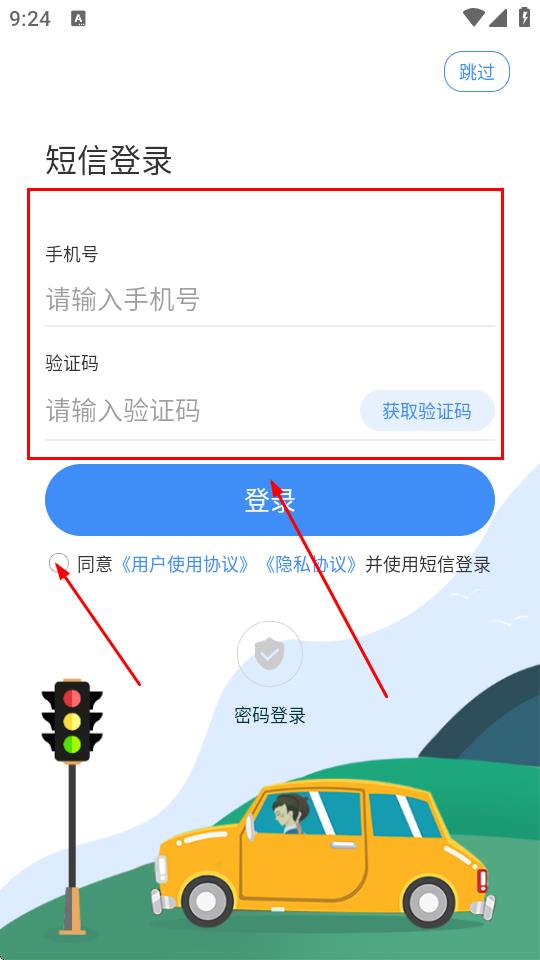 4、進(jìn)入短信登錄頁面,輸入手機(jī)號(hào),輸入點(diǎn)驗(yàn)證碼,勾選同意《用戶使用協(xié)議》《隱私協(xié)議》,點(diǎn)擊登錄。