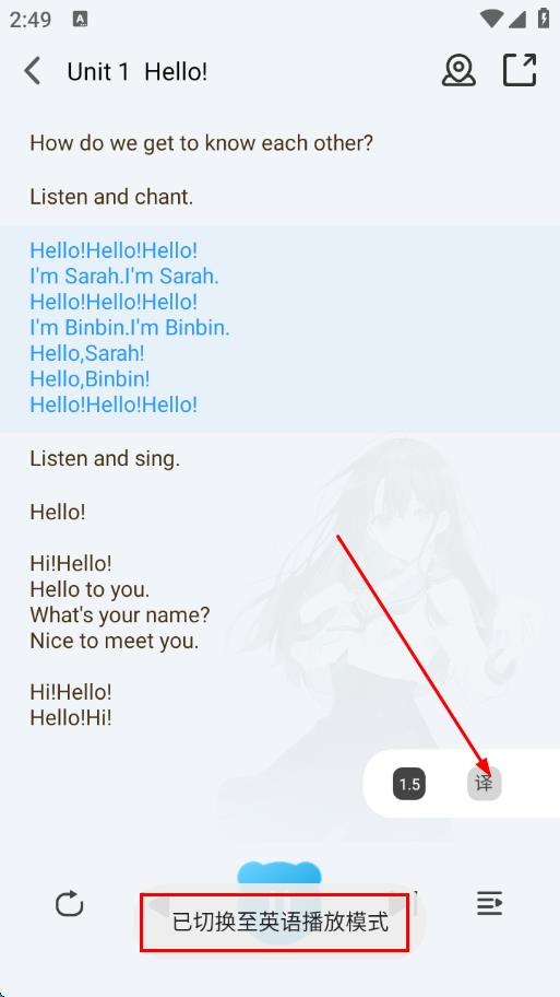 3、在播放界面,點(diǎn)擊右下角的譯按鈕,可以切換中英文播放模式。