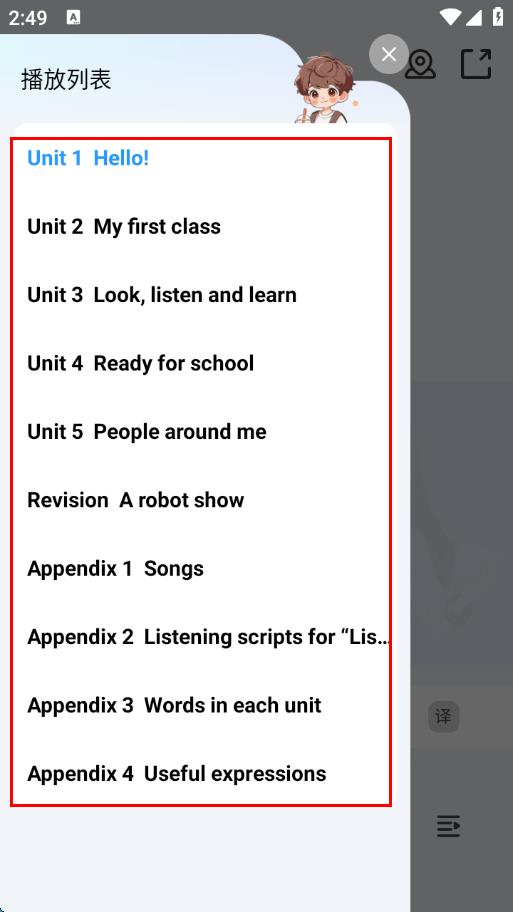 4、可查看播放列表,有所有單元及附錄內(nèi)容 ,點(diǎn)擊相應(yīng)內(nèi)容可快速跳轉(zhuǎn)播放。