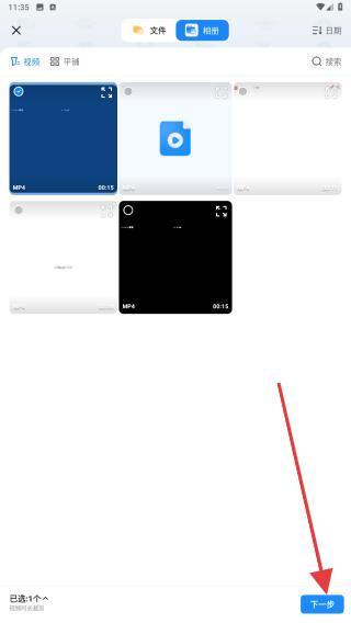 2、在選擇界面內(nèi),選擇需要裁剪的視頻再點(diǎn)擊下一步。