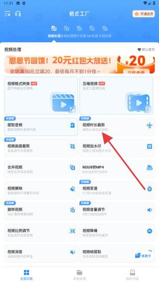1、打開格式工廠的軟件,在首頁內(nèi)點(diǎn)擊視頻時(shí)長裁剪的按鈕。