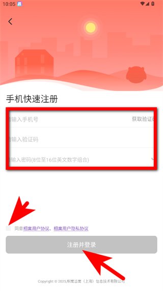 4、輸入信息并勾選同意協(xié)議,點(diǎn)擊注冊(cè)并登錄按鈕,即可完成注冊(cè)操作。
