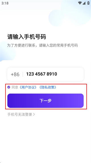 1、在用戶協(xié)議及隱私政策界面點(diǎn)擊同意按鈕,進(jìn)入請(qǐng)輸入手機(jī)號(hào)碼界面。
