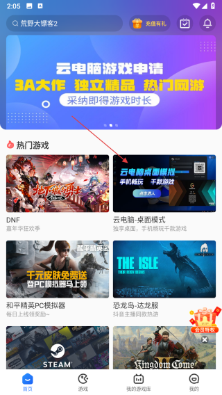 1、打開云電腦應(yīng)用進(jìn)入首頁,在熱門游戲區(qū)域找到云電腦-桌面模式選項,點擊進(jìn)入該模式介紹頁面。
