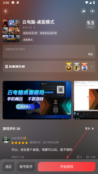 2、在云電腦-桌面模式介紹頁面中,查看游戲介紹、資費(fèi)標(biāo)準(zhǔn)等信息后,點擊下方紅色的開始游戲按鈕。