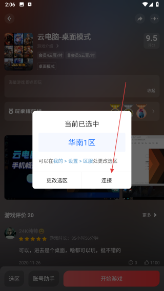 3、點擊開始游戲后,若未選擇區(qū)服會彈出選區(qū)提示,完成選區(qū)操作,然后點擊連接,即可進(jìn)入云電腦桌面模式開始使用。