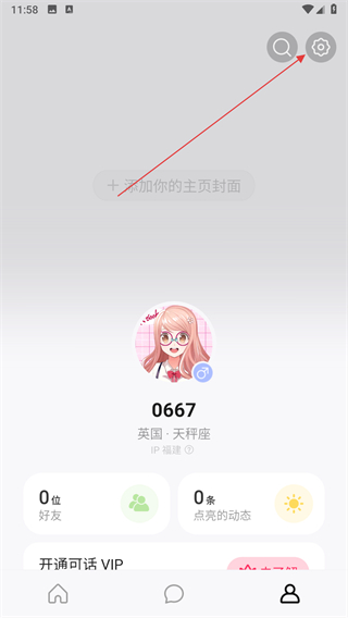 2、在個人頁面中,點擊右上角的設(shè)置圖標(biāo),進入設(shè)置界面。