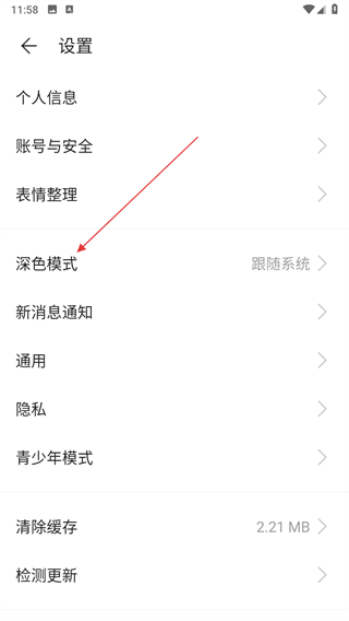 3、在設(shè)置界面里,找到深色模式選項并點擊。