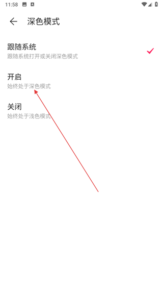4、進入深色模式設(shè)置頁后,點擊開啟選項,即可開啟深色模式。