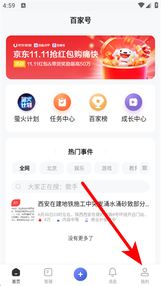 1、打開(kāi)百家號(hào)首頁(yè),點(diǎn)擊底部導(dǎo)航欄的我的,進(jìn)入個(gè)人相關(guān)頁(yè)面。