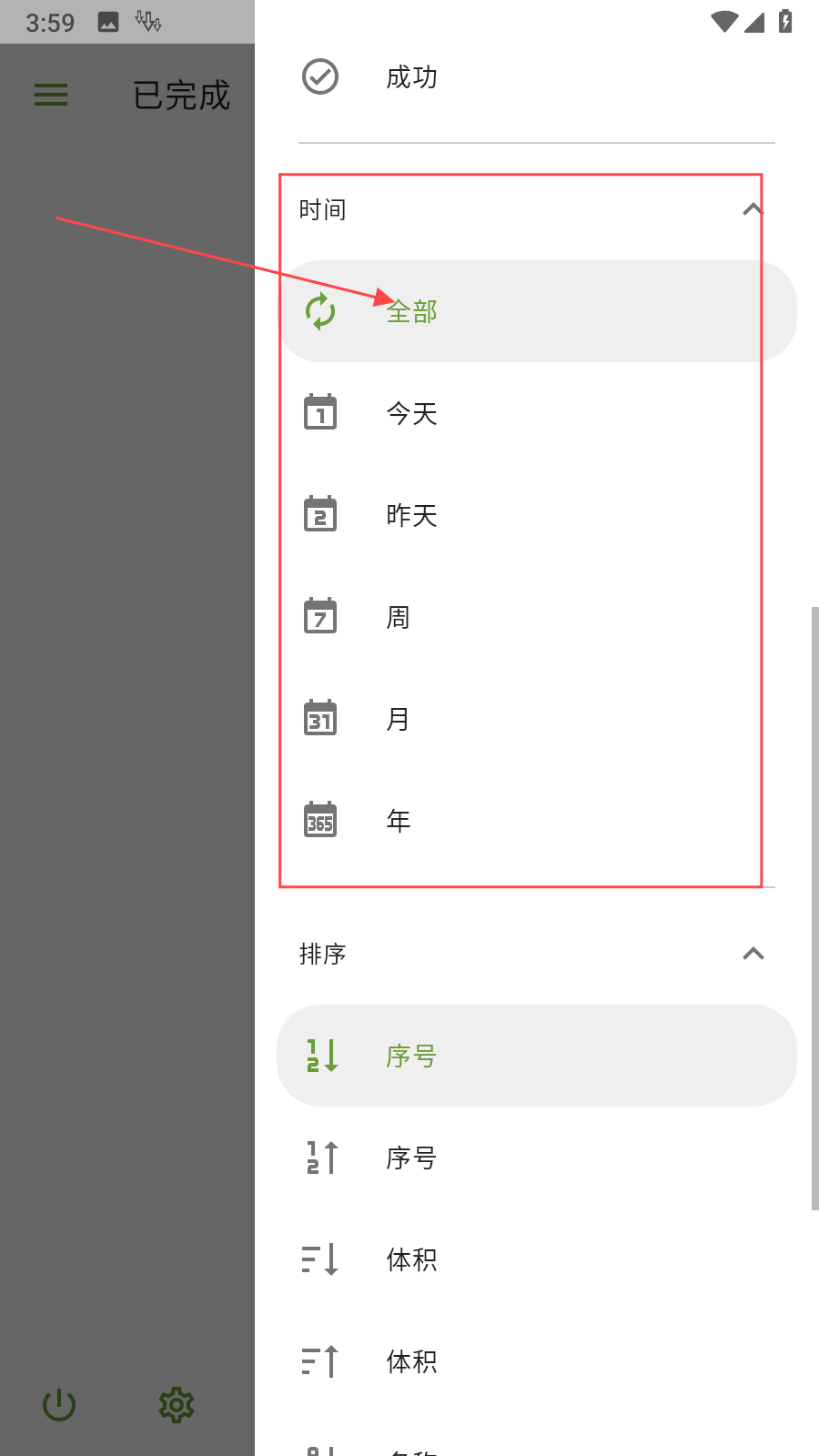 3、回到主界面,進(jìn)入已完成等下載記錄頁(yè)面,點(diǎn)擊篩選圖標(biāo),能按時(shí)間進(jìn)行篩選,,方便快速找到特定時(shí)間段下載的文件,還能對(duì)下載文件按序號(hào)、體積、名稱等進(jìn)行排序查看。