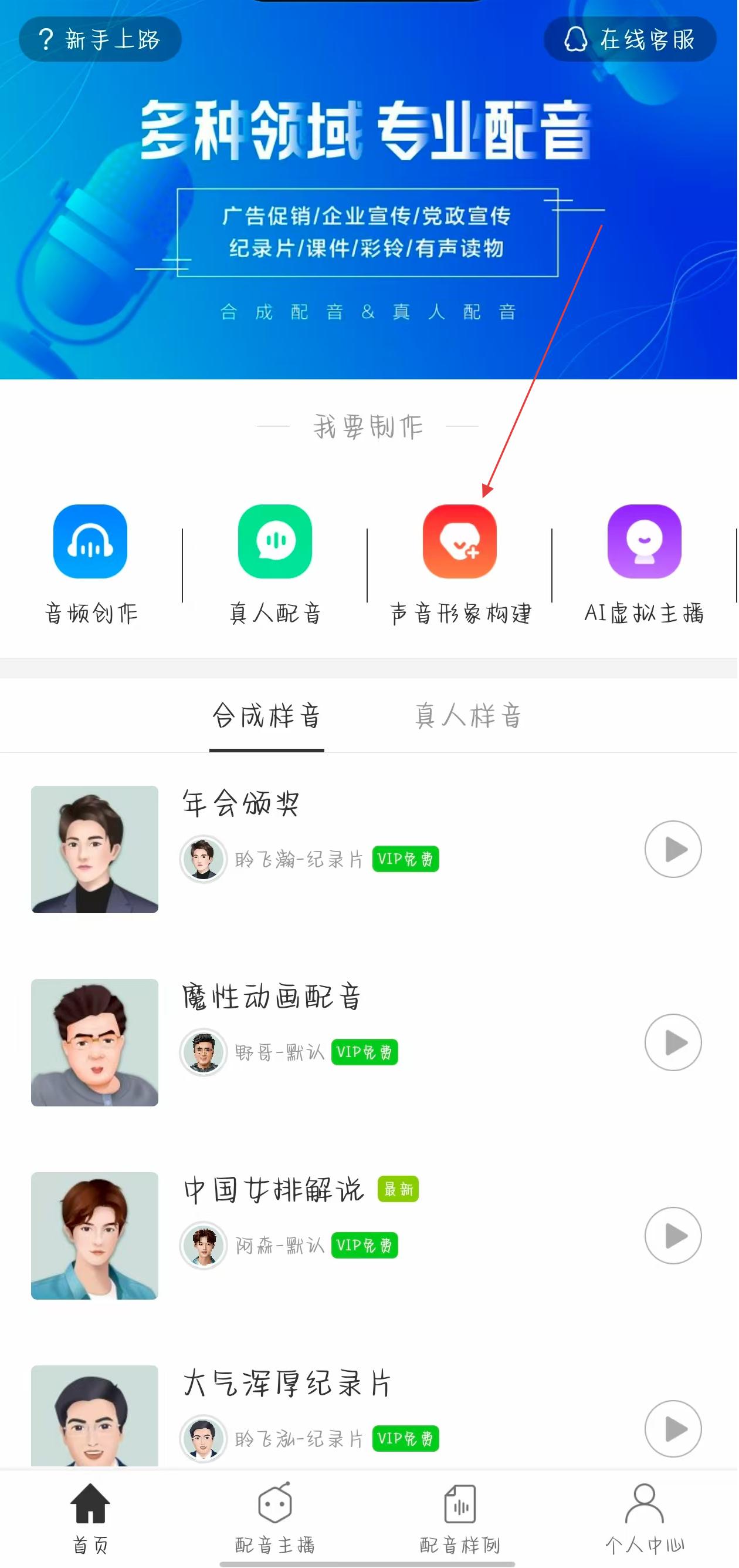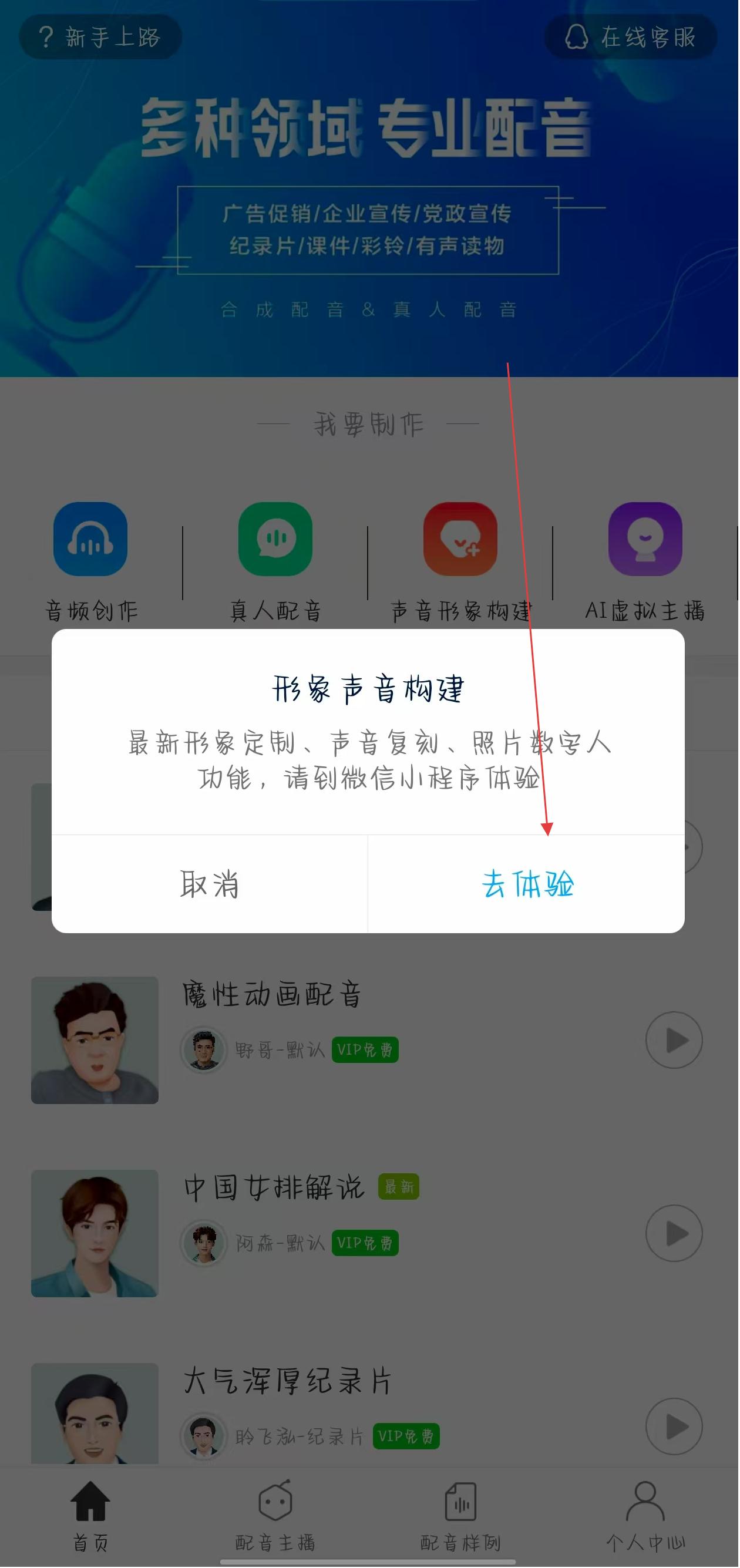 1、打開(kāi)訊飛配音應(yīng)用,在首頁(yè)我要制作板塊找到聲音形象構(gòu)建圖標(biāo)并點(diǎn)擊,彈出提示框后選擇去體驗(yàn),跳轉(zhuǎn)至微信小程序訊飛智作。